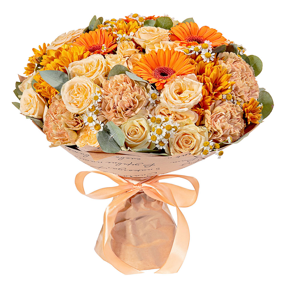 На фото представлен образец. Объем букета зависит от выбранного вами размера. Точное количество цветов и цветовую гамму вы можете уточнить у менеджера по телефону.
