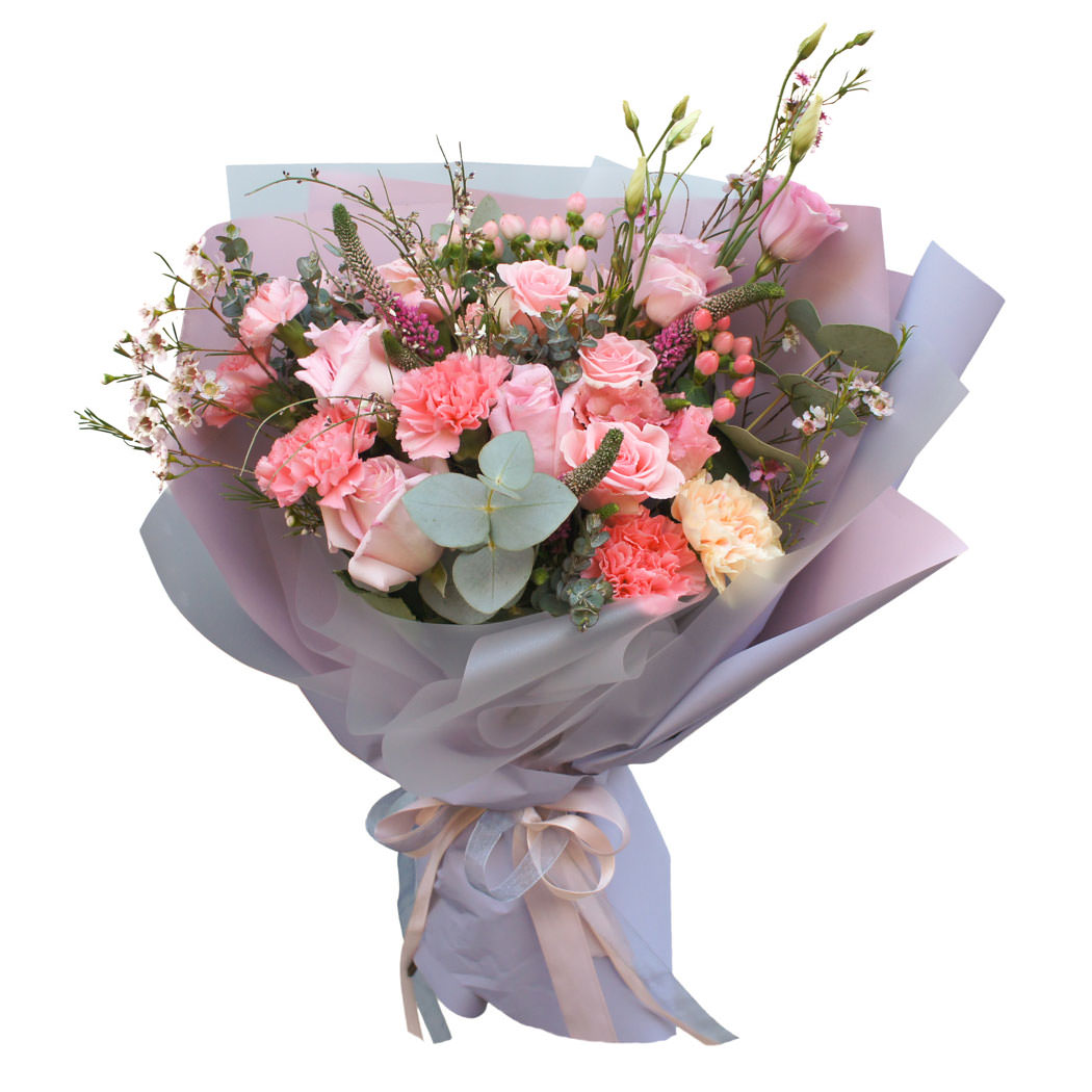 На фото представлен образец. Объем букета зависит от выбранного вами размера. Точное количество цветов и цветовую гамму вы можете уточнить у менеджера по телефону.