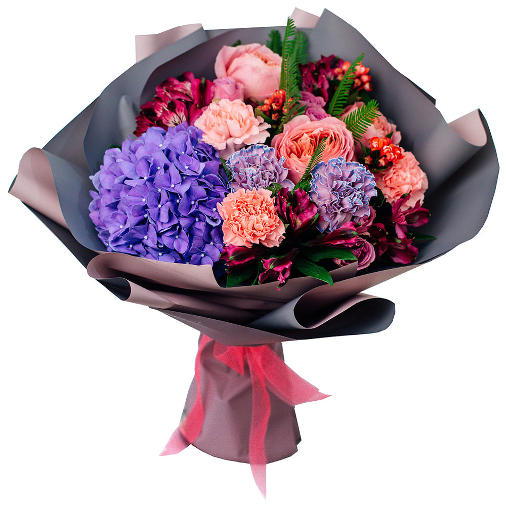 На фото представлен образец. Объем букета зависит от выбранного вами размера. Точное количество цветов и цветовую гамму вы можете уточнить у менеджера по телефону.